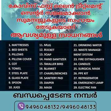 മരുതോങ്കര പഞ്ചായത്തിലെ കോവിഡ് 19 ഫസ്റ്റ് ലൈൻ ട്രീറ്റ്മെൻ്റ് സെൻ്ററാക്കി മാറ്റുവാൻ ഉദ്ദേശിക്കുന്ന *മരുതോങ്കര സെൻ്റ് മേരീസ് ഹയർ സെക്കണ്ടറി സ്കൂൾ* ക്ലീനിംഗ് നടത്തി അവശ്യ സജ്ജീകരണങ്ങൾ ഏർപ്പെടുത്തുവാനായി നാളെ രാവിലെ 9 മണിക്ക് (21/07/ 2020 ചൊവ്വാഴ്ച) സന്നദ്ധ സേവകരായി യുവാക്കളെ ക്ഷണിക്കുകയാണ് - കൂടാതെ *ഫസ്റ്റ് ലൈൻ ട്രീറ്റ്മെൻ്റ് സെൻ്ററി* ലേക്കാവശ്യമായ ആവശ്യവസ്തുക്കൾ സ്പോൺസർ ചെയ്യാൻ ഉദാരമതികളായ മുഴുവൻ മനുഷ്യ സ്നേഹികളോടും അഭ്യർത്ഥിക്കുന്നു. അവിശ്യമുള്ള സാധങ്ങൾ 1. Mattresses 2.Bed sheets 3.Pillows 4.Pillow Cover 5.Cot 6.Towel 7.Steel Plate 8.Glass Plate 9.Spoon 10.Jugs 11.Mug 12.Bucket 13.Soap 14.Hand Sanitizer 15. Smaller Bins 16. Blanket 17. Chairs/Benches 18. Sanitary pad 19. Diapers 20. Mask 21. Drinking Water - 100 22. Waste Management system 23. Fire extinguisher 24. Candles 25. Surgical mask 26. PPE Kit 27. Refrigerator - 1 28. Emergency lamp 29. Electric fan