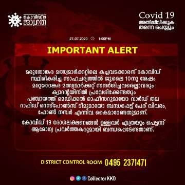 മരുതോങ്കര : മത്സ്യ മാർക്കറ്റിലെ തൊഴിലാളിയിൽ നിന്നും സമ്പർക്കം ഉണ്ടായതിന്റെ പേരിൽ പഞ്ചായത്തിലെ മുഴുവൻ വാർഡുകളും കണ്ടൈൻറ്മെൻറ് സോൺ ആയി കളക്ടർ ഉത്തരവിറക്കി. മറ്റു പഞ്ചായത്തുകളിൽ നിന്നും മരുതോങ്കര പഞ്ചായത്തിലേക്കുള്ള പ്രവേശനം നിരോധിച്ചു. ജൂലൈ 10 -ആം തീയ്യതി മുതൽ ഈ മത്സ്യ തൊഴിലാളിയുമായിട്ട് സമ്പർക്കം വന്നിട്ടുള്ള എല്ലാവരും കോവിഡ് പരിശോധനക് വിധേ യാറാകേണ്ടതാണ്. ബുധനാഴ്ച നടത്തുന്ന ടെസ്റ്റ് ഇൽ പരിഗണിക്കാൻ. സമ്പർക്കമുള്ളവർ വാർഡ് മെമ്പര്മാരെയോ ആരോഗ്യവിഭാഗം ആളുകളുമായി ഉടൻ ബന്ധപ്പെടേണ്ടതാണ. മരുതോങ്കര മത്സ്യ മാർക്കറ്റിലെ ജോലിക്കാരന് കോവിഡ് പോസിറ്റീവ് ആയ സാഹചര്യത്തിൽ അവരുമായി പ്രാഥമിക സമ്പർക്കത്തിൽ ഏർപ്പെട്ട മുഴുവൻ ആളുകളും ക്വാറന്റൈനിൽ പ്രവേശിക്കേണ്ടതും കുറ്റ്യാടി പഞ്ചായത്തിൽ ഉൾപ്പെട്ടവർ അതത് വാർഡ് ചുമതലയുള്ള ഹെൽത്ത് വർക്കറെ വിവരം അറിയിക്കേണ്ടതുമാണ്.. വാർഡ് ചുമതലയുള്ള വര്ക്കര്മാരുടെ നമ്പർ ചുവടെ ചേർക്കുന്നു.. വാർഡ് 1, 3 -പ്രേമജൻ - 9747818283 വാർഡ് 2, 14 -സിമി - 6238136538 വാർഡ് 4, 9 - വിമല - 9495564934 വാർഡ് 5, 6 -സലാം 9539313699 വാർഡ് 7, 8 - ഷിജില -9745272949 വാർഡ് 10, 11 - ശ്രീജ - 9947208757 വാർഡ് 12, 13 - സുബിഷ 9562853838 ഹെൽത്ത് ഇൻസ്പെക്ടർ - വിനോദ് - 9446547057