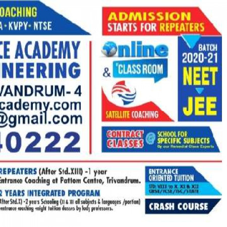 No. 1 Entrance Academy for Medicine - NEET & Engineering -J E E & Special / Individual Maths & Science Tuition at Pattom, Trivandrum run by Remedial class specilists & Entrance Coaching faculties. Online - Class Room classes - Satellite Coaching available
