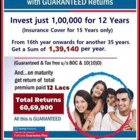 Fortune Guarantee Plus ഒരു ലക്ഷം രൂപാ പ്രീമിയം 12 വർഷങ്ങൾ അടച്ച്, 15 വർഷത്തെ ഇൻഷുറൻസ് കവറേജും, 16 മത്തെ വർഷം മുതൽ 1,39,140 രൂപ 35 വർഷത്തേയ്ക്ക് ലഭിക്കും, കൂടാതെ നമ്മൾ അടച്ച 12 ലക്ഷം രൂപ 35 മത്തെ വർഷം തിരികെ ലഭിക്കുന്നു. മൊത്തത്തിൽ 60,69,900 രൂപ ലഭിക്കുന്നു.