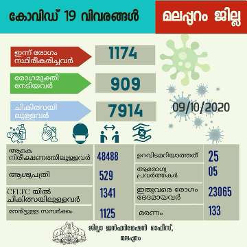09/10/2020 മലപ്പുറം ജില്ലയില് 1,174 പേര്ക്ക് കൂടി കോവിഡ് 19 സ്ഥിരീകരിച്ചു 909 പേര്ക്ക് രോഗമുക്തി നേരിട്ടുള്ള സമ്പര്ക്കത്തിലൂടെ 1,125 പേര്ക്ക് വൈറസ്ബാധ ഉറവിടമറിയാതെ രോഗബാധിതരായവര് 25 പേര് അഞ്ച് ആരോഗ്യ പ്രവര്ത്തകര്ക്കും രോഗബാധ രോഗബാധിതരായി ചികിത്സയില് 7,914 പേര് ആകെ നിരീക്ഷണത്തിലുള്ളത് 48,488 പേര് ഇന്ന് രോഗം സ്ഥിരീകരിച്ചവരില് 25 പേര്ക്ക് ഉറവിടമറിയാതെയാണ് രോഗബാധയുണ്ടായത്. അഞ്ച് ആരോഗ്യ പ്രവര്ത്തകര്ക്കും രോഗം സ്ഥിരീകരിച്ചിട്ടുണ്ട്. ഇന്ന് രോഗബാധയുണ്ടായവരില് 11 പേര് ഇതര സംസ്ഥാനങ്ങളില് നിന്നെത്തിയവരും ശേഷിക്കുന്ന എട്ട് പേര് വിവിധ വിദേശ രാജ്യങ്ങളില് നിന്നെത്തിയവരുമാണ്. ഇന്ന് 909 പേരാണ് ജില്ലയില് വിദഗ്ധ ചികിത്സയ്ക്ക് ശേഷം രോഗമുക്തരായത്. 23,065 പേര് ഇതുവരെ കോവിഡ് പ്രത്യേക ചികിത്സയ്ക്ക് ശേഷം രോഗം ഭേദമായി വീടുകളിലേക്ക് മടങ്ങി. നിരീക്ഷണത്തില് 48,488 പേര് 48,488 പേരാണ് ഇപ്പോള് ജില്ലയില് നിരീക്ഷണത്തിലുള്ളത്. 7,914 പേര് വിവിധ ചികിത്സാ കേന്ദ്രങ്ങളില് നിരീക്ഷണത്തിലുണ്ട്. കോവിഡ് പ്രത്യേക ചികിത്സാ കേന്ദ്രങ്ങളായ ആശുപത്രികളില് 529 പേരും വിവിധ കോവിഡ് ഫസ്റ്റ് ലൈന് ട്രീറ്റ്മെന്റ് സെന്ററുകളില് 1,341 പേരുമാണ് നിരീക്ഷണത്തിലുള്ളത്. മറ്റുള്ളവര് വീടുകളിലും കോവിഡ് കെയര് സെന്ററുകളിലുമായി ആരോഗ്യ വകുപ്പിന്റെ പ്രത്യേക നിരീക്ഷണത്തില് കഴിയുന്നു. ഇതുവരെ 133 പേരാണ് കോവിഡ് ബാധിതരായി ജില്ലയില് മരണമടഞ്ഞത്. . ജില്ലാതല കണ്ട്രോള് സെല് നമ്പറുകള്: 0483 2737858, 2737857, 2733251, 2733252, 2733253.