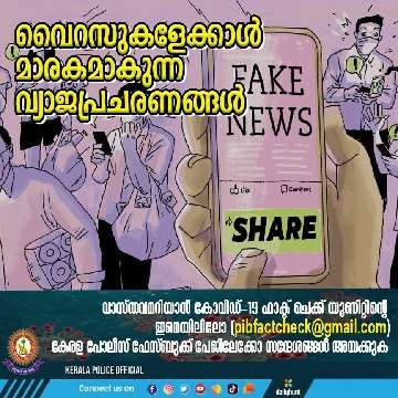 വൈറസുകളേക്കാൾ മാരകമാകുന്ന വ്യാജപ്രചരണങ്ങൾ കൊറോണ വൈറസുമായി ബന്ധപ്പെട്ട് ധാരാളം വ്യാജവാർത്തകളും തെറ്റായ വിവരങ്ങളും സമൂഹ മാധ്യമങ്ങളിൽ പ്രചരിക്കുന്നുണ്ട് പ്രചരിക്കുന്ന വിവരങ്ങളുടെ നിജസ്ഥിതി പരിശോധിക്കുന്നതിന് കേന്ദ്ര വാര്ത്താ വിതരണ പ്രക്ഷേപണ മന്ത്രാലയത്തിന് കീഴിലുള്ള പ്രസ് ഇന്ഫര്മേഷന് ബ്യൂറോയില് കോവിഡ്-19 ഫാക്ട് ചെക്ക് യൂണിറ്റ് പ്രവര്ത്തനമാരംഭിച്ചു. pibfactcheck@gmail.com എന്ന ഇമെയിലില് ഫാക്ട് ചെക്ക് യൂണിറ്റിലേക്ക് സന്ദേശങ്ങള് പരിശോധനയ്ക്കായി അയക്കാം. അവയ്ക്ക് നിശ്ചിത സമയത്തിനുള്ളില് മറുപടി ലഭിക്കുന്നതായിരിക്കും. കോവിഡ്-19 നുമായി ബന്ധപ്പെട്ട ഏത് വാര്ത്തയുടെയും ഔദ്യോഗിക ഭാഷ്യം യൂണിറ്റില് നിന്ന് ലഭിക്കുന്നതാണ്. കൂടാതെ കേരള പോലീസ് ഫേസ്ബുക്ക് പേജിലേക്ക് സന്ദേശങ്ങള് അയച്ചും വ്യാജ സന്ദേശങ്ങളുടെ യാഥാർഥ്യം തിരക്കാവുന്നതാണ്.
