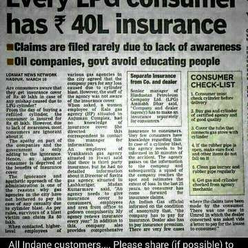 ഓരോ indane gas ഉപഭോക്താ വും 40 ലക്ഷം ഇൻഷുറൻസ് കവറേജ് അർഹത യുള്ളതാണ്. ഇത് ഒരു മാധ്യമ മോ, ഗ്യാസ് കമ്പനി യോ ഉപഭോക്താക്ക വിനോട് പറയുന്നില്ല.